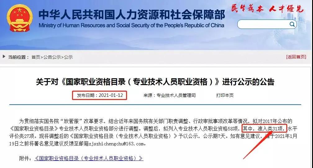 2021年1月12日,人社部對(duì)2017年公布的職業(yè)資格進(jìn)行調(diào)整并公示,調(diào)整后,擬列入專業(yè)技術(shù)人員職業(yè)資格58項(xiàng),其中準(zhǔn)入類31項(xiàng),水平評(píng)價(jià)類27項(xiàng)。