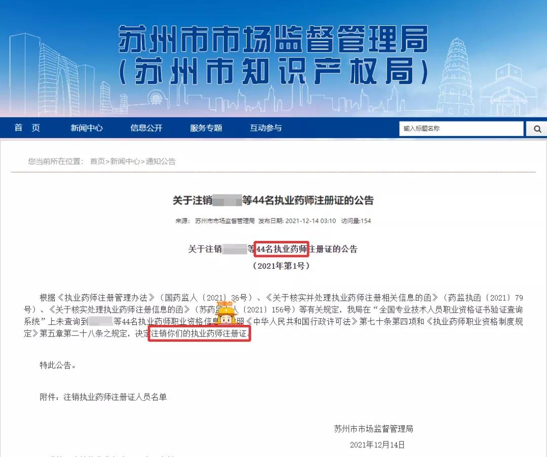12月14日,蘇州市市監(jiān)局發(fā)布公告,經(jīng)查有44名執(zhí)業(yè)藥師違規(guī)“掛證”,最終被處罰注銷執(zhí)業(yè)藥師注冊證。