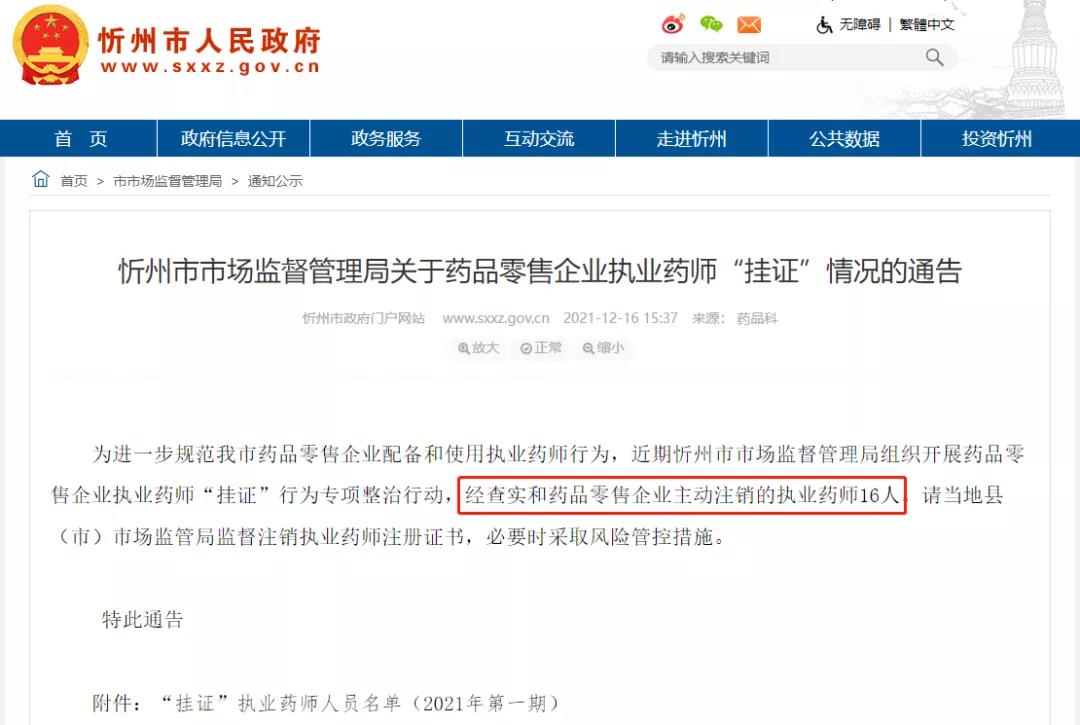 12月16日,忻州市市場監(jiān)督管理局發(fā)布關(guān)于藥品零售企業(yè)執(zhí)業(yè)藥師“掛證”情況的通告。