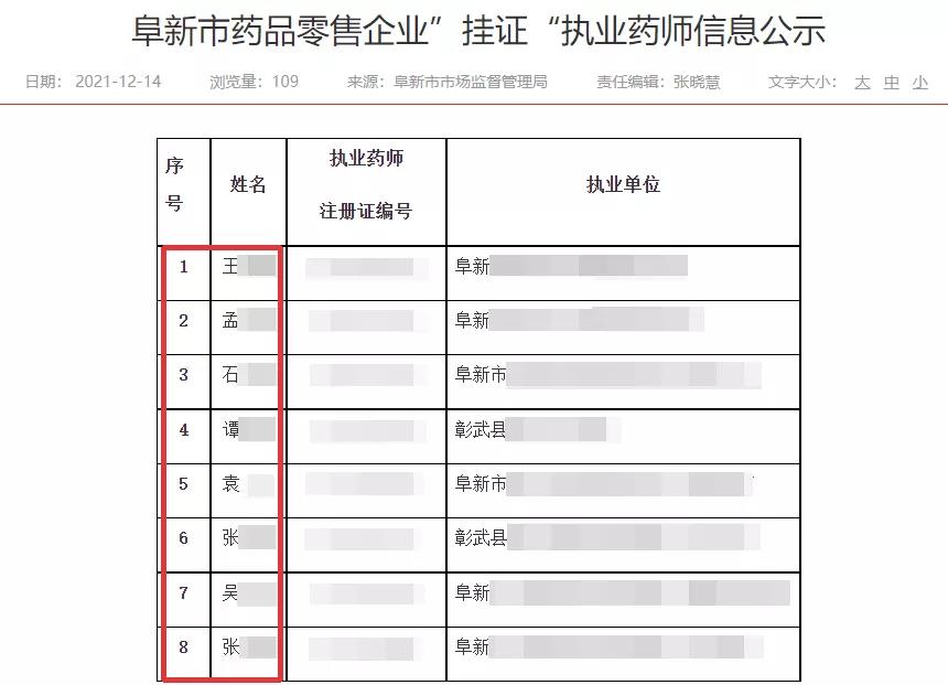 12月14日,阜新市市監(jiān)局公布8名“掛證”執(zhí)業(yè)藥師信息,其他信息未曾披露。