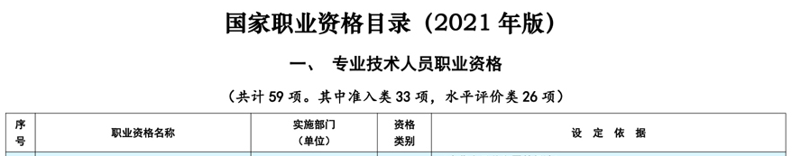 2021年版國家職業(yè)資格目錄共計72項(xiàng)職業(yè)資格。其中,專業(yè)技術(shù)人員職業(yè)資格59項(xiàng),含準(zhǔn)入類33項(xiàng),水平評價類26項(xiàng);技能人員職業(yè)資格13項(xiàng)。目錄中準(zhǔn)入類職業(yè)資格關(guān)系公共利益或涉及國家安全、公共安全、人身健康、生命財產(chǎn)安全,均有法律法規(guī)或國務(wù)院決定作為依據(jù);水平評價類職業(yè)資格具有較強(qiáng)的專業(yè)性和社會通用性,技術(shù)技能要求較高,行業(yè)管理和人才隊(duì)伍建設(shè)確實(shí)需要。