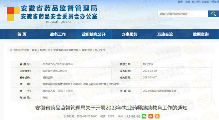 安徽省藥品監(jiān)督管理局關(guān)于開(kāi)展2023年執(zhí)業(yè)藥師繼續(xù)教育工作的通知