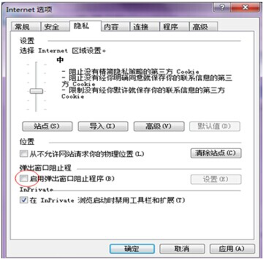 IE瀏覽器菜單欄→工具選項(xiàng)下“Internet選項(xiàng)”→隱私選項(xiàng)卡中將倒數(shù)第二個(gè)復(fù)選框“啟用彈出窗口阻止程序”取消勾選,最后點(diǎn)擊【確定】。效果如下圖: