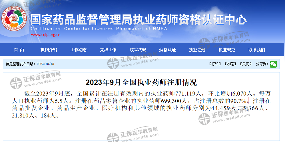 通過國(guó)家藥監(jiān)局執(zhí)業(yè)藥師認(rèn)證中心發(fā)布的全國(guó)執(zhí)業(yè)藥師注冊(cè)情況來看,九成以上為注冊(cè)于藥品零售企業(yè)。