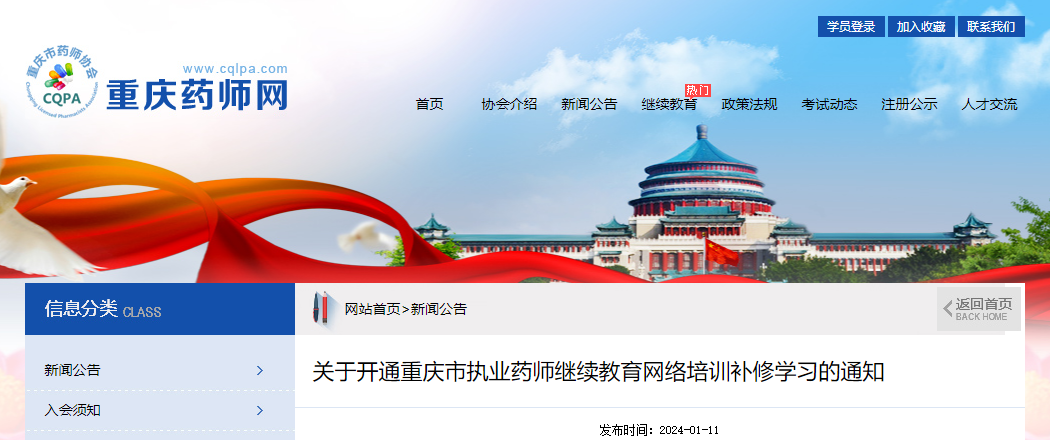 年末歲初,為方便重慶市部分執(zhí)業(yè)藥師繼續(xù)教育網(wǎng)絡(luò)培訓(xùn)補(bǔ)修學(xué)習(xí),及時(shí)依法注冊(cè),《重慶藥師網(wǎng)》將于2024年1月11日開通重慶市執(zhí)業(yè)藥師繼續(xù)教育網(wǎng)絡(luò)培訓(xùn)補(bǔ)修學(xué)習(xí),屆時(shí)學(xué)員可報(bào)名補(bǔ)修2018年至2023年期間的執(zhí)業(yè)藥師繼續(xù)教育學(xué)時(shí)學(xué)分。