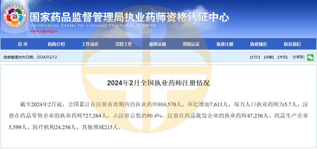 全國(guó)累計(jì)在注冊(cè)有效期內(nèi)的執(zhí)業(yè)藥師804,570人,環(huán)比增加7,611人,每萬(wàn)人口執(zhí)業(yè)藥師為5.7人。注冊(cè)在藥品零售企業(yè)的執(zhí)業(yè)藥師727,264人,占注冊(cè)總數(shù)的90.4%。注冊(cè)在藥品批發(fā)企業(yè)的執(zhí)業(yè)藥師47,236人、藥品生產(chǎn)企業(yè)5,599人、醫(yī)療機(jī)構(gòu)24,256人、其他領(lǐng)域215人。