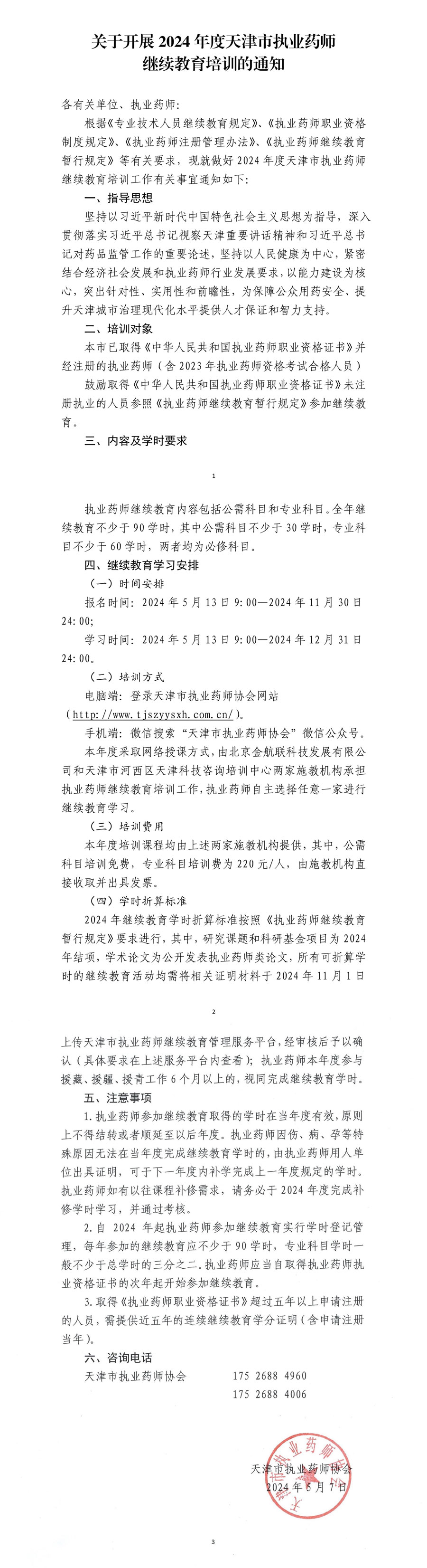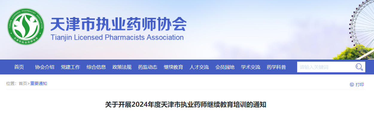 【天津】2024年天津市執(zhí)業(yè)藥師繼續(xù)教育培訓(xùn)通知