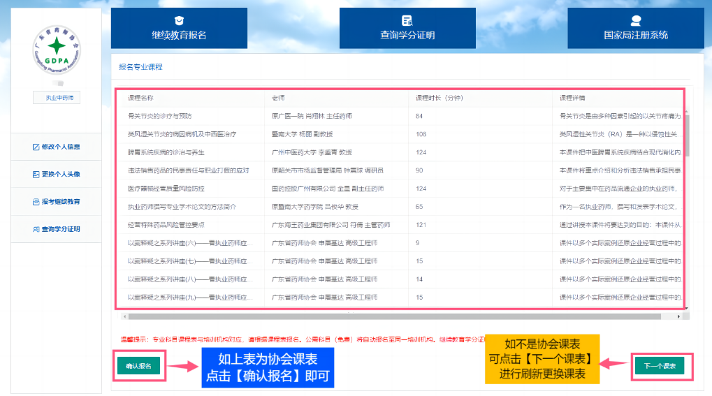 2、登錄成功后,核實或完善個人信息和個人頭像,然后選擇“繼續(xù)教育報名”,點擊選擇學習年份(2024),選擇廣東省藥師協(xié)會課程列表(見下表截圖,不同的課程代表不同的施教機構),確認報名,點擊跳轉。