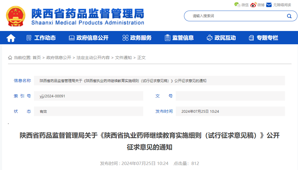 為進(jìn)一步完善全省執(zhí)業(yè)藥師繼續(xù)教育管理制度,加強(qiáng)執(zhí)業(yè)藥師隊伍建設(shè),依據(jù)《執(zhí)業(yè)藥師繼續(xù)教育暫行規(guī)定》(國藥監(jiān)人〔2024〕3號),省藥監(jiān)局起草了《陜西省執(zhí)業(yè)藥師繼續(xù)教育實施細(xì)則(試行征求意見稿)》,現(xiàn)向社會公開征求意見,請于2024年8月9日前將修改意見(紙質(zhì)版及電子版均可)反饋至省藥監(jiān)局人事處或指定郵箱。
