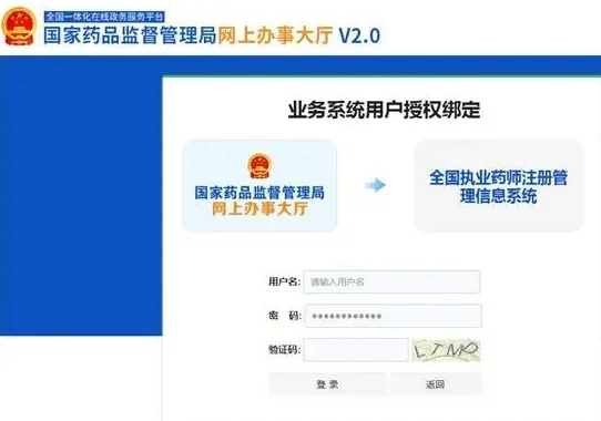 首次辦理執(zhí)業(yè)藥師注冊用戶,進行業(yè)務系統(tǒng)用戶授權綁定,選擇“已有用戶的登錄授權”。