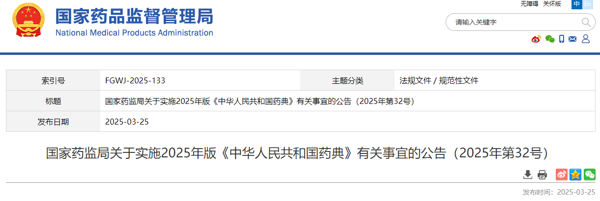 國(guó)家藥監(jiān)局關(guān)于實(shí)施2025年版《中華人民共和國(guó)藥典》有關(guān)事宜的公告