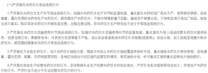 自轟動(dòng)全國(guó)的疫苗事件后,全國(guó)各地區(qū)、國(guó)家藥監(jiān)局等相關(guān)部門均發(fā)布了一些有關(guān)提高民眾用藥安全措施的公告,國(guó)家藥監(jiān)局近日制定了《中藥飲片質(zhì)量集中整治工作方案》,該方案中表示,要嚴(yán)厲查處中藥飲片違法違規(guī)行為,重點(diǎn)查處中藥材進(jìn)廠把關(guān)不嚴(yán),使用摻雜使假、染色增重、霉?fàn)€變質(zhì)的中藥材生產(chǎn)中藥飲片,超范圍生產(chǎn)中藥飲片。堅(jiān)決取締無證生產(chǎn)經(jīng)營(yíng)中藥飲片的非法窩點(diǎn),嚴(yán)厲打擊私切濫制等非法加工、變相生產(chǎn)中藥飲片的行為,嚴(yán)厲打擊不法分子無證經(jīng)營(yíng)中藥飲片的行為。