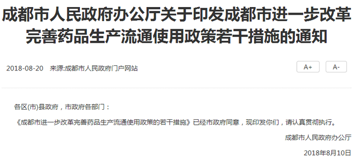 成都市人民政府辦公廳關(guān)于印發(fā)成都市進(jìn)一步改革完善藥品生產(chǎn)流通使用政策若干措施的通知中表示: