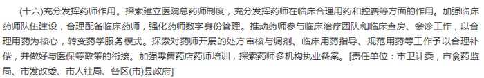 “(十六)充分發(fā)揮藥師作用。探索建立醫(yī)院總藥師制度,充分發(fā)揮藥師在臨床合理用藥和控費(fèi)等方面的作用。加強(qiáng)臨床藥師隊(duì)伍建設(shè),合理配備臨床藥師,強(qiáng)化藥師數(shù)字身份管理。推動藥師參與臨床治療團(tuán)隊(duì)和臨床查房、會診工作,以合理用藥為核心,轉(zhuǎn)變藥學(xué)服務(wù)模式。探索對藥師開展的處方審核與調(diào)劑、臨床用藥指導(dǎo)、規(guī)范用藥等工作予以合理補(bǔ)償,并做好與醫(yī)保等政策的銜接。加強(qiáng)零售藥店藥師培訓(xùn),探索藥師多機(jī)構(gòu)執(zhí)業(yè)備案”。