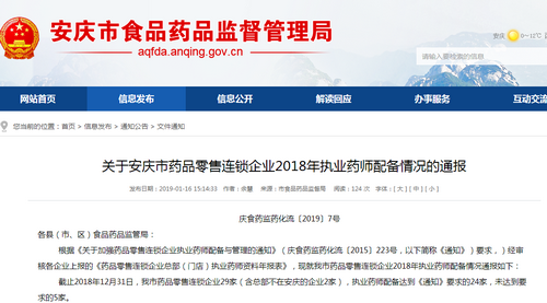 2019年1月16日,安徽省安慶市發(fā)布了《關(guān)于安慶市藥品零售連鎖企業(yè)2018年執(zhí)業(yè)藥師配備情況的通告》(以下簡稱為《通告》),該通告中,對執(zhí)業(yè)藥師配備符合要求的企業(yè)名單進行的列舉及公布,同時也對執(zhí)業(yè)藥師配備未達到要求的企業(yè)名單進行了列舉及公布,其中,對于未達到要求的企業(yè)將按照文件要求,不予受理其新開辦(含兼并、收購)門店申請。執(zhí)業(yè)藥師配備不到位,藥店新開門店被拒絕!
