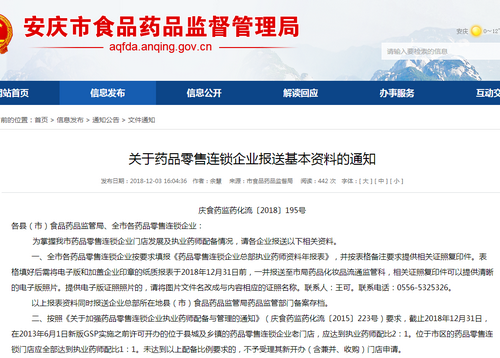 早在2018年12月3日,安慶市就發(fā)布了一條通知——《關(guān)于藥品零售連鎖企業(yè)報送基本資料的通知》以下簡稱為《通知12.3》,該《通知12.3》的目的就是為了請各企業(yè)報送以下相關(guān)資料,以掌握安慶市藥品零售連鎖企業(yè)門店發(fā)展及執(zhí)業(yè)藥師配備情況。