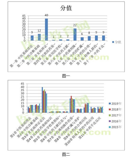 2015年-2019年這5年中,中藥學(xué)專業(yè)知識(二)這門課程中單味中藥與中成藥的分值比例基本是保持為1:1,不同題型分值分配保持為最佳選擇題(40分)、配伍選擇題(60分)、綜合分析選擇題(10分)、多項選擇題(10分),總計120分。同時各章節(jié)分值變化幅度整體不大,重點章節(jié)主要集中在單味中藥第1、2、4、6、8、11、12、13、17、18章,中成藥的第1章。