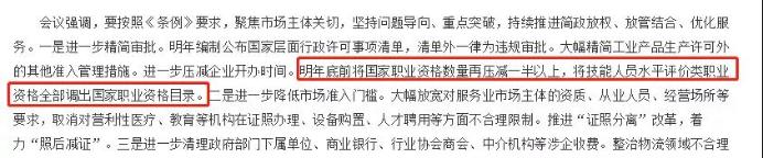 其中值得我們關(guān)注的是,總理在會(huì)議上強(qiáng)調(diào),明年年底前將國(guó)家職業(yè)資格數(shù)量再壓減一半以上,將技能人員水平評(píng)價(jià)類職業(yè)資格全部調(diào)出國(guó)家職業(yè)資格目錄。