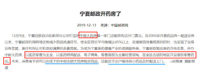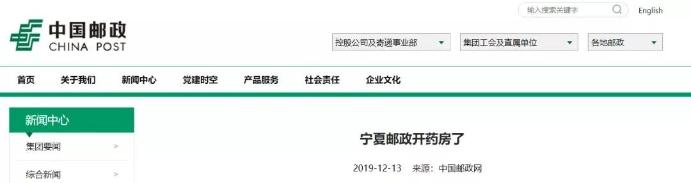 根據(jù)中國郵政官方網(wǎng)站消息,中國郵政于2019年12月9日在寧夏開了第一家中郵大藥房。