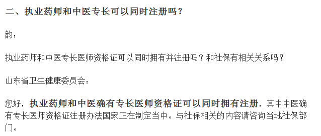 近期,有網(wǎng)友詢問官網(wǎng)“執(zhí)業(yè)藥師和中醫(yī)專長可以同時注冊嗎?”,該問題得到了山東省衛(wèi)生健康委員會的官方回復(fù),二者可以兼得!