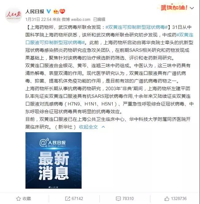 1月31日從中國(guó)科學(xué)院上海藥物所獲悉,該所和武漢病毒所聯(lián)合研究初步發(fā)現(xiàn),中成藥雙黃連口服液可抑制新型冠狀病毒。消息昨晚一經(jīng)發(fā)布,全世界都沸騰了!“雙黃連可抑制新型冠狀病毒”,立即登上了微博熱搜。