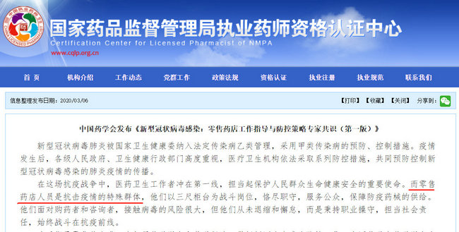3月6日,國(guó)家藥品監(jiān)督管理局執(zhí)業(yè)藥師資格認(rèn)證中心,在發(fā)布中國(guó)藥學(xué)會(huì)《新型冠狀病毒感染:零售藥店工作指導(dǎo)與防控策略專(zhuān)家共識(shí)(第一版)》中明確指出:
