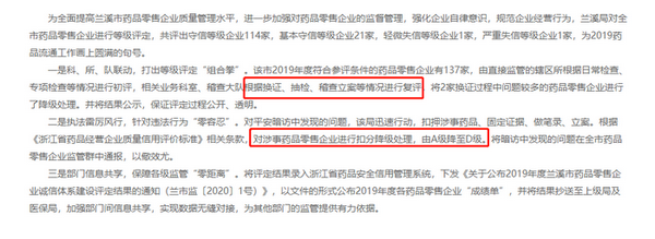 據(jù)了解,此次評(píng)定是按照《浙江省藥品經(jīng)營(yíng)企業(yè)藥品質(zhì)量信用評(píng)價(jià)標(biāo)準(zhǔn)》相對(duì)應(yīng)的條款為每家藥店打分,年度得分93分及以上的為A級(jí),85~92分為B級(jí),80~84分為C級(jí),80分以下為D級(jí)。