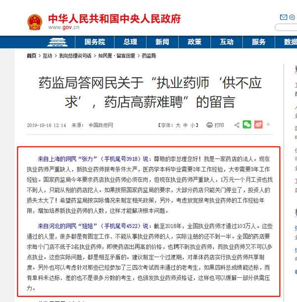 早在2019年10月16日,國(guó)家藥監(jiān)局就針對(duì)網(wǎng)民提到的“執(zhí)業(yè)藥師太難招,建議放寬或調(diào)整相關(guān)政策”等問(wèn)題進(jìn)行了回復(fù)。對(duì)調(diào)整執(zhí)業(yè)藥師配備政策,藥監(jiān)局明確,“結(jié)合實(shí)際,進(jìn)一步探索完善執(zhí)業(yè)藥師差異化配備政策。”