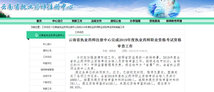 云南省2019年度執(zhí)業(yè)藥師職業(yè)資格考試達到考試合格標準的人員共計4960人,按要求提交資格審查材料的4199人,逾期未提交資格審查材料的761人,通過資格審查的4150人,未通過資格審查的49人,資格審查符合率為98.83%。
