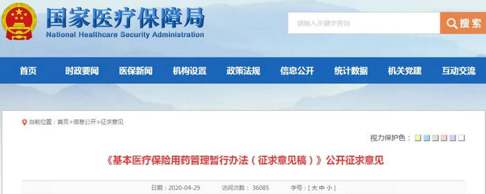 4月29日,國(guó)家醫(yī)保局發(fā)布《《基本醫(yī)療保險(xiǎn)用藥管理暫行辦法(征求意見(jiàn)稿)》公開征求意見(jiàn)》,公開向公眾征求意見(jiàn)。公眾可在2020年5月12日前提出意見(jiàn)和建議,以書面或電子郵件的形式向國(guó)家醫(yī)保局反映。