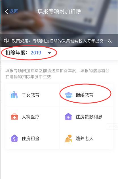 第二步:選擇專項(xiàng)附加扣除填報(bào)(2019年考的證,年份就選2019年,按要求填報(bào)即可)。