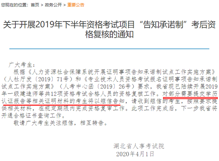以當(dāng)年度報(bào)考所在的省份為主,有些省份需要考后審核或復(fù)查。比如今年4月1日,湖北省人事考試網(wǎng)發(fā)布消息——關(guān)于開展2019下半年資格考試項(xiàng)目“告知承諾書”考后資格復(fù)核的通知”,其中提到:對(duì)部分需要提交學(xué)歷認(rèn)證報(bào)告等相關(guān)證明材料的考生將以短信告知,請(qǐng)收到短信的考生,按照要求提供相關(guān)材料,在規(guī)定期限內(nèi)完成資格復(fù)審工作。此項(xiàng)工作完成后,下一步我省將開通合格證書查詢工作。