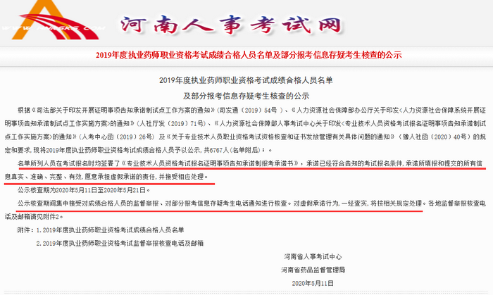 還有河南人事考試網(wǎng)也在5月11日發(fā)布,《2019年度執(zhí)業(yè)藥師職業(yè)資格考試成績(jī)合格人員名單及部分報(bào)考信息存疑考生核查的公示》,公示核查期間集中接受對(duì)成績(jī)合格人員的監(jiān)督舉報(bào)、對(duì)部分報(bào)考信息存疑考生電話通知進(jìn)行核查。對(duì)虛假承諾行為,一經(jīng)查實(shí),將按相關(guān)規(guī)定處理。