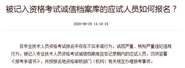 在專業(yè)技術(shù)人員資格考試報(bào)名中存在不實(shí)承諾行為,或因嚴(yán)重、特別嚴(yán)重違紀(jì)違規(guī)行為,被記入專業(yè)技術(shù)人員資格考試誠信檔案庫且在記錄期內(nèi)的應(yīng)試人員,仍須簽署《報(bào)考承諾書》,并按報(bào)名地資格審核部門(機(jī)構(gòu))有關(guān)規(guī)定辦理報(bào)考事項(xiàng)。