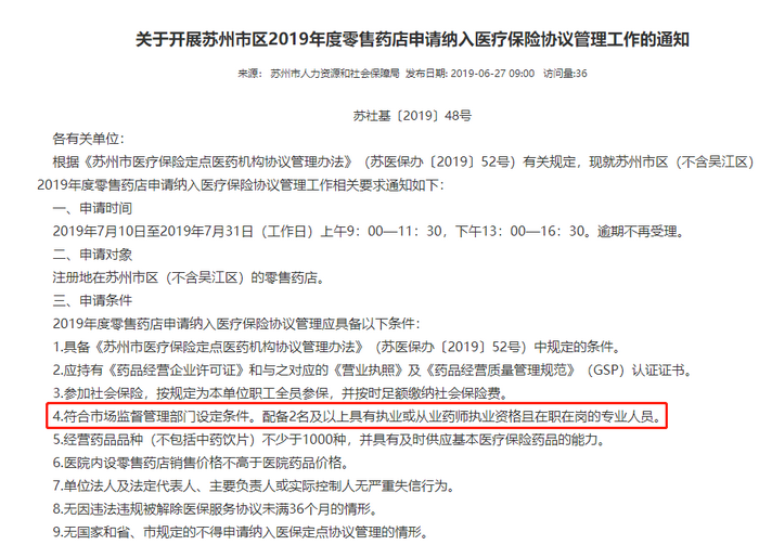 2019年6月份,江蘇省蘇州市就在發(fā)布零售藥店申請(qǐng)定點(diǎn)的通知中,講清楚了相關(guān)的申請(qǐng)條件,其中就包括了:“符合市場(chǎng)監(jiān)督管理部門設(shè)定條件。配備2名及以上具有執(zhí)業(yè)或從業(yè)藥師執(zhí)業(yè)資格且在職在崗的專業(yè)人員。”