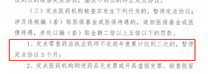 定點(diǎn)零售藥店執(zhí)業(yè)藥師不在崗年度累計(jì)達(dá)到3次的,暫停定點(diǎn)協(xié)議3個(gè)月。