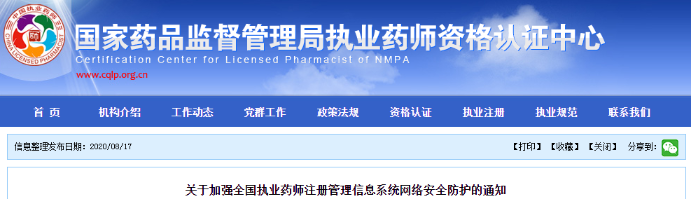 為加強(qiáng)國家藥監(jiān)局網(wǎng)絡(luò)安全防護(hù),2020年8月14日-2020年8月30日期間,國家藥監(jiān)局信息中心擬對包括全國執(zhí)業(yè)藥師注冊管理信息系統(tǒng)在內(nèi)的國家局業(yè)務(wù)系統(tǒng)開展網(wǎng)絡(luò)安全監(jiān)測,提高網(wǎng)絡(luò)安全等級。此項(xiàng)工作將對全國執(zhí)業(yè)藥師注冊管理信息系統(tǒng)使用造成一定影響?,F(xiàn)將有關(guān)情況通知如下: