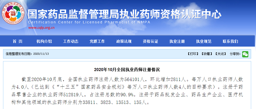 官方發(fā)布2020年10月全國(guó)執(zhí)業(yè)藥師注冊(cè)情況具體數(shù)據(jù)!