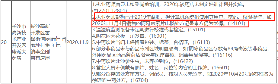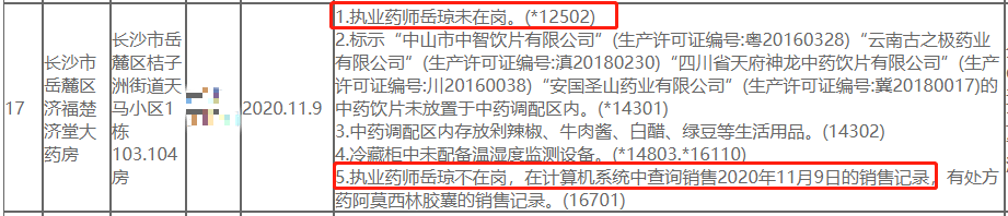 由公示詳情中可知,此次長沙市20家藥店飛檢中存在的主要原因均為: