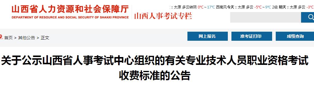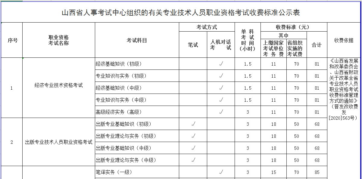 根據(jù)《山西省發(fā)展和改革委員會(huì)、山西省財(cái)政廳關(guān)于改革全省專業(yè)技術(shù)人員職業(yè)資格考試收費(fèi)標(biāo)準(zhǔn)管理方式的通知》(晉發(fā)改收費(fèi)發(fā)[2020]563號(hào))的規(guī)定,現(xiàn)將山西省人事考試中心組織實(shí)施的有關(guān)專業(yè)技術(shù)人員職業(yè)資格考試收費(fèi)標(biāo)準(zhǔn)予以公示。其中,上繳國(guó)家考試單位的考務(wù)費(fèi)標(biāo)準(zhǔn)如有變化,按調(diào)整后的標(biāo)準(zhǔn)執(zhí)行。