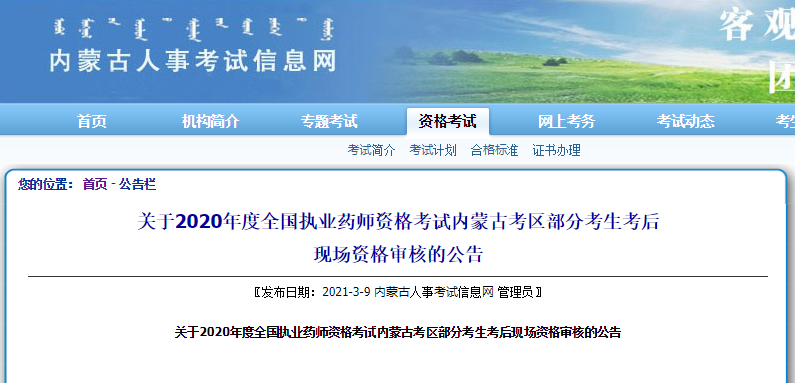 最新消息,內(nèi)蒙古人事考試信息網(wǎng)發(fā)布公告,對部分可能存在提交偽造、變造的學歷證書、職稱證書、學位證書、聘用證明的2020年執(zhí)業(yè)藥師考生進行考后現(xiàn)場資格審核。內(nèi)蒙古考生等了這么久的的通知終于來了,話不多說,趕快來看看具體要求吧!