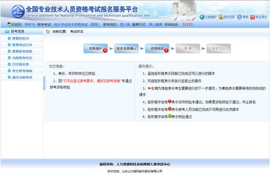 如果資格核驗(yàn)不通過,考生可以通過考試狀態(tài)頁面的狀態(tài)信息欄查看到資格核驗(yàn)不通過的原因,如確實(shí)不符合報(bào)考條件,可以點(diǎn)擊左側(cè)【修改報(bào)名信息】修改報(bào)名條件重新進(jìn)行報(bào)名信息確認(rèn),等待考試機(jī)構(gòu)審核。(見下圖)。