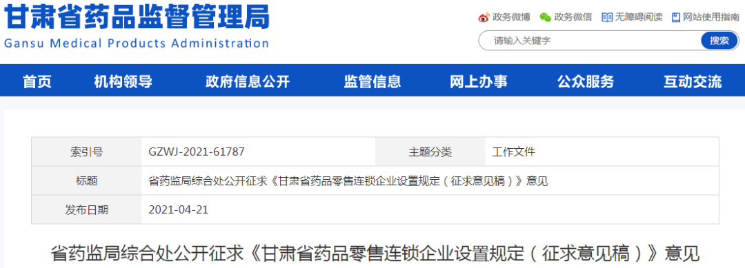 甘肅省藥品監(jiān)督管理局綜合處公開征求《甘肅省藥品零售連鎖企業(yè)設(shè)置規(guī)定(征求意見稿)》意見。