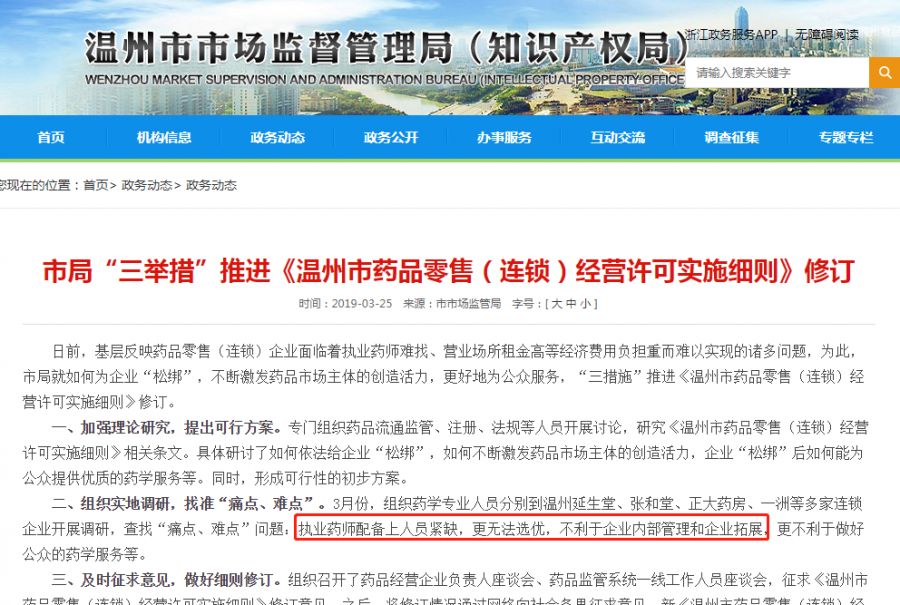 溫州市市場監(jiān)督管理局“三舉措”推進《溫州市藥品零售(連鎖)經(jīng)營許可實施細則》修訂,其中一則內(nèi)容,查找“痛點、難點”問題:執(zhí)業(yè)藥師配備上人員緊缺,更無法選優(yōu),不利于企業(yè)內(nèi)部管理和企業(yè)拓展,更不利于做好公眾的藥學服務(wù)。