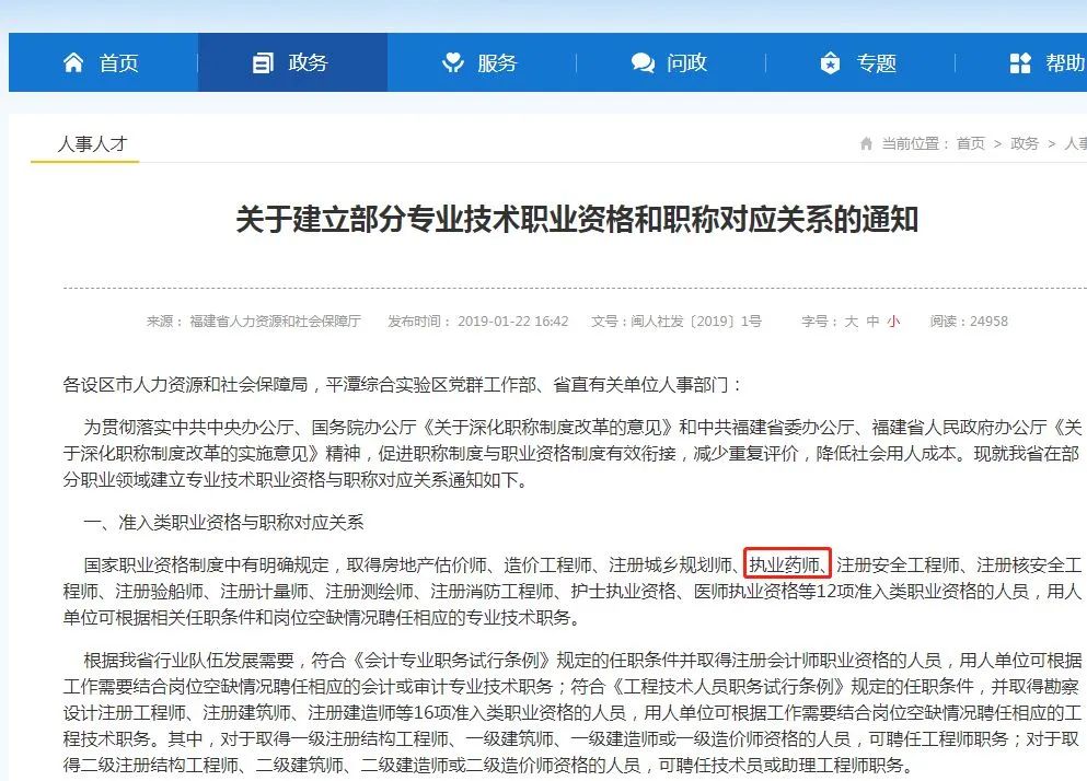 福建省人力資源和社會(huì)保障廳發(fā)布了《關(guān)于建立部分專業(yè)技術(shù)職業(yè)資格和職稱對應(yīng)關(guān)系的通知》,通知提到用人單位可根據(jù)相關(guān)任職條件和崗位空缺情況聘任相應(yīng)的專業(yè)技術(shù)職務(wù),其中,執(zhí)業(yè)藥師可聘主管藥師(中藥師)專業(yè)技術(shù)職務(wù)!