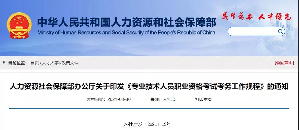 近日,人社部發(fā)布關(guān)于印發(fā)《專業(yè)技術(shù)人員職業(yè)資格考試考務(wù)工作規(guī)程》的通知,本規(guī)程自2021年4月1日起施行。