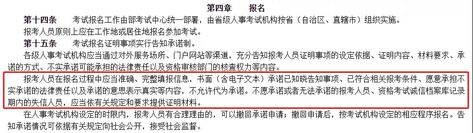 人社廳發(fā)(2021)18號:報考人員在報名過程中應(yīng)當(dāng)準(zhǔn)確、完整填報信息,書面(含電子文本)承諾已知曉告知事項、已符合相關(guān)報考條件、愿意承擔(dān)不實承諾的法責(zé)任以及承諾的意思表示真實等內(nèi)容,不允許代為承諾。不愿承諾或者無法承諾的報考人員、資格考試誠信檔案庫記錄期內(nèi)的失信人員,應(yīng)當(dāng)依有關(guān)規(guī)定和要求提供證明材料。