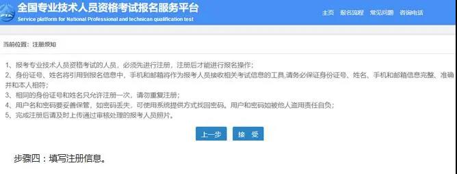 2.閱讀《專業(yè)技術人員資格考試網(wǎng)上報名協(xié)議》,點擊接受,即可進行下一步。