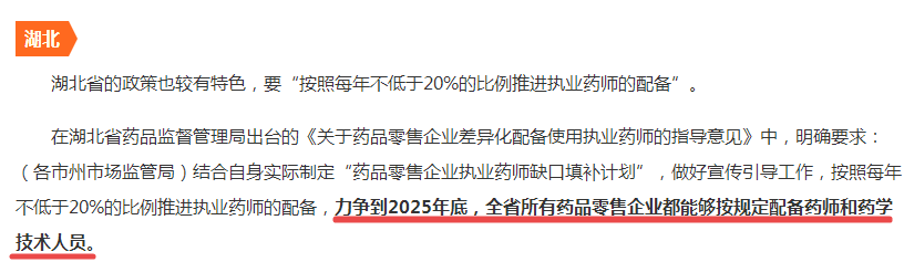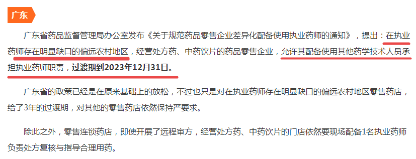 除甘肅外,全國(guó)已有多個(gè)省份發(fā)布了本地區(qū)的執(zhí)業(yè)藥師差異化配備的具體實(shí)施計(jì)劃,不少省份,例如廣東、四川、青海、遼寧、安徽、陜西、新疆、寧夏等地都有要求省內(nèi)部分地區(qū)提前完成執(zhí)業(yè)藥師配備,最早要求明年必須配齊。