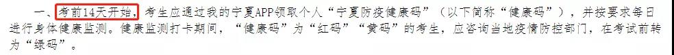 受疫情影響,進(jìn)出入考場必須要出示健康碼。部分省區(qū)有提前14天打卡監(jiān)測的規(guī)定,比如寧夏: